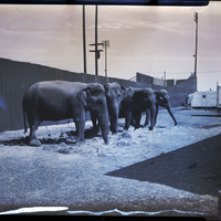 Four elephants stand outside eating hay while the William Kay-Shrine Circus is set up at Jaycee Park in Twin Falls. The circus was sponsored by the Magic Valley Shrine clubs. A fence runs behind them, and a trailer is in the background.