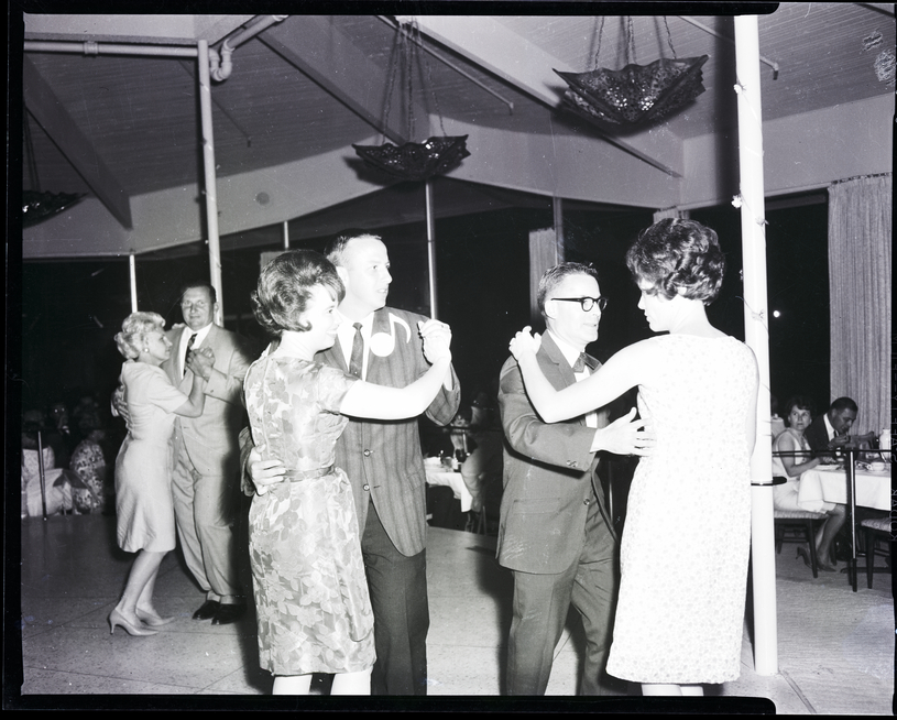 Three couples dance to music of the Allen DeVries Orchestra at a Blue Lakes Country Club social held by new members for old members. The men are wearing suits and ties and the women are wearing dresses, and one man has a large music note pinned on his jacket. In the background, people are seated at small circular dining tables eating dinner. Chandeliers hang from the ceiling.