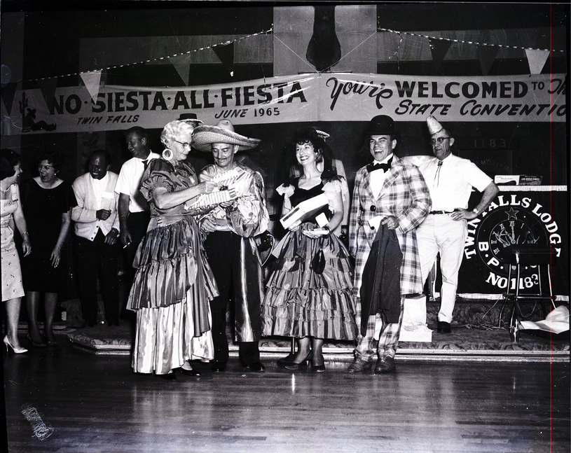 Winners for a craziest costume contest receive their awards at a BPOE convention held in Twin Falls. Mr. and Mrs. Charles Engalls of Boise, winners of the best dressed couple award, are dressed in Spanish clothing, and Charles Engalls wears a large sombrero. Beside them are the winners of the best dressed individual awards, Mrs. Arthur Swanson, dressed in a fancy ruffled dress, and Frank Hike, dressed in a checkered coat with a bow tie and bowler hat. A man in a pointed hat and a group of people stand behind them on the stage. A large banner hanging over the stage reads "No Siesta All Fiesta, Twin Falls, June 1965" and "You're welcomed to the state convention." A podium on stage reads "Twin Falls Lodge B.P.O.E. No 1182" around the Elks Club seal.