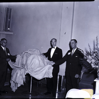 patients at the center. Chester Stahl and Art Swanson are dressed in suits and ties, and Dick Williams wears a suit and bow tie. Some chairs and an ashtray are along the wall behind them. In the corner, a bouquet of flowers sits on a pedestal. A few folding chairs are in the foreground.