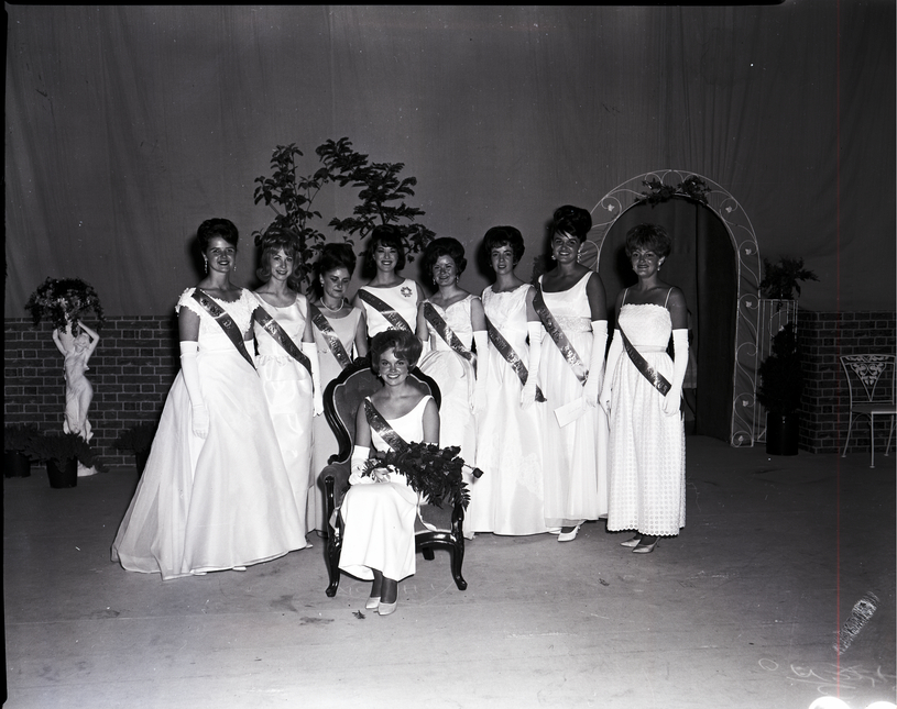 Cheryl Couch, winner of the Miss Twin Falls pageant, is seated and holding a bouquet of roses, while the other contestants stand behind her, including runners-up Pamela Jones and Deanna Peterson. The event was sponsored by the Twin Falls Lions Club and held at the Twin Falls High School gymnasium. All are dressed in formal gowns and sashes, and Cheryl Couch wears a tiara. Some potted plants, a statue holding a flower arrangement, an arched doorway, and a chair are in the background.