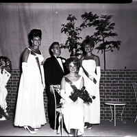 Cheryl Couch, winner of the Miss Twin Falls pageant, is seated and holding a bouquet of roses, while runners-up Pamela Jones and Deanna Peterson stand behind her with a man. The event was sponsored by the Twin Falls Lions Club and held at the Twin Falls High School gymnasium. The women are dressed in formal gowns and sashes, and Cheryl Couch wears a tiara. The man wears a tuxedo with a bow tie and has a corsage in his jacket. Some potted plants, a statue holding a flower arrangement, and a table and chair are in the background.