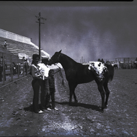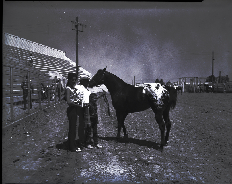 Frank Harney, dressed in a cowboy hat, holds the reigns of Boomer Britches, the grand champion stallion at the Idaho-Oregon-Nevada Appaloosa Horse Show. The horse is owned by Robert Harney of Twin Falls. A woman and young boy stand beside him. A group of people walk to the side of the corral, next to some bleachers. Some other horses and owners are in the background.