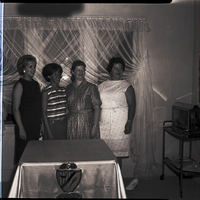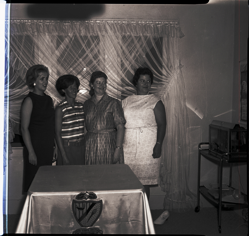 Beta Sigma Phi Omicron chapter officers were installed during special ceremonies. From left to right are Mrs. Roy Farrar, president, Mrs. Mike Tegan, vice president, Beverly Richardson, secretary, and Mrs. W. L. Zimmerman, treasurer. In front of them is a table with a table cloth draped over it that has the Beta Sigma Phi coat of arms insignia on it. In the corner of the room is an aquarium on a television stand. Behind them is a window covered with drapes.