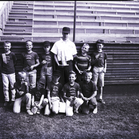 The Speedsters Knothole baseball team, sponsored by Farm and City, pose together in a baseball field at Harmon Park. From left to right standing, are Dennis Hubbell, Carl Schrank, Bob Williams, Coach Dave Gibbons, Bunchy Lewis, and Noel Briggs, and from left to right kneeling are Kevin Packard, Kenny Stewart, Kerry Requia, Gary Stuart and Dave Nye. The young boys are wearing baseball caps and t-shirts that read "Times-News Knothole Baseball" and are holding award ribbons. A man holding a trophy stands with them. Bleachers are in the background behind them.