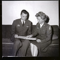 CAP Captain Susan Shaw and Captain Clyde N. Carlson sit on a couch and look over a manila folder of plans for special activities. Capt. Shaw is Idaho Wing Information officer for the CAP and Capt. Carlson is deputy for training of the wing. Together they arrange the international and inter-regional tours awarded to outstanding cadets. They are dressed in their Civil Air Patrol uniforms. Capt. Shaw is wearing tags that read "Civil Air Patrol Idaho" and "USA Auxiliary Civil Air Patrol." Capt. Carlson is wearing tags that read "USA Auxiliary Civil Air Patrol" and "Carlson."