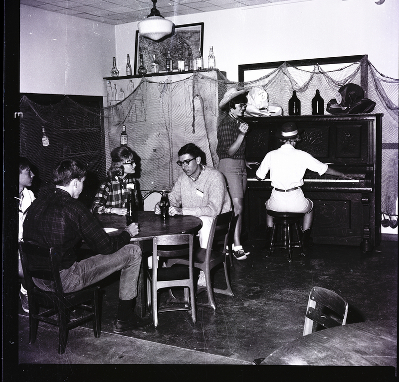 A group of people sit around a table drinking bottles of Coca-Cola at a Walther League Convention held at the Memorial Lutheran Church. The theme of the convention was "Pioneers for Christ." The room is decorated to look like a saloon, using empty bottles on top of a cabinet and fishing nets draped from the walls. A piano is against the wall, and a girl in a cowboy hat is playing it. Another girl in a cowboy hats stands beside her, holding a drink. On top of the piano are some fake cowboy hat decorations that read "Twin in '65." An aerial photograph hangs on the back wall.