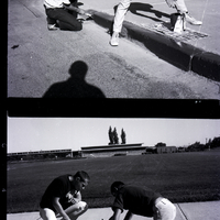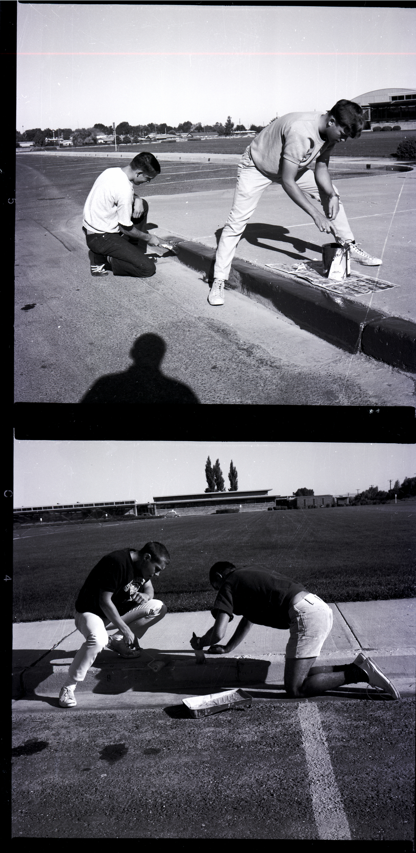In the top image, Dave Wanzenried, left, and Dennis Samples, right, paint the curb in front of Twin Falls High School as a school service project by the Interact Club. The Interact Club, who are sponsored by the Rotary Club, plan to erect a marquee to announce school events for their next service project. The high school building, part of the parking lot, and some houses are visible in the background.