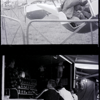 In the top image, two little boys sit inside the car of a carnival ride at the Twin Falls County Fair. Other carnival rides are seen in the background. In the bottom image, a group of boys stand outside a Midway booth. A man and a woman are inside the booth, giving directions. One boy is holding a gun, ready to shoot for prizes. Inside the booth is a wall of boxes of Crackerjacks, and stuffed animals hang from the ceiling.
