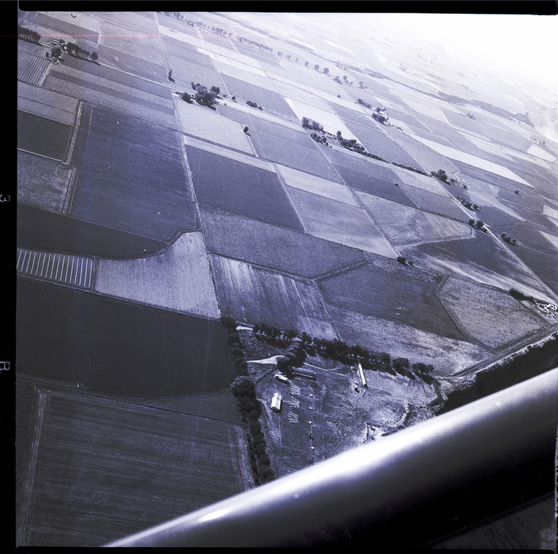 - An aerial view shows a small piece of annexed land sitting on the edge of a cliff. The land is lined by trees, and some buildings are on it. A road is visible at the bottom of the cliff face. Several roads, fields, and trees are visible in the aerial view.