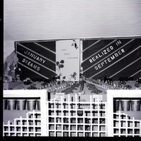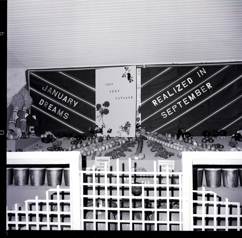 The Buhl Grange No. 214 booth receives the "1st Premium Best Artistic Arrangement" award at the Twin Falls County Fair. The exhibit shows an arrangement of fruits and vegetables, several of which have award ribbons. Behind the display is a large board that reads "January Dreams Realized in September." A 1965 Seed Catalog is propped up against the backdrop of the display. Several metal buckets line the display, and watermelons, pumpkins, and other squash sit beneath it.