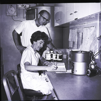 Lab technicians Art Busacker and Pat Hankins log in a shipment of blood at Magic Valley Memorial Hospital. Some bottles of blood are sitting on the counter, and the labels read "A Positive," "O," and "Citrated Whole Blood (Human)." Several diagrams and forms hang on a bulletin board above the counter, and above the bulletin board are some cupboards.