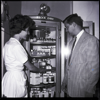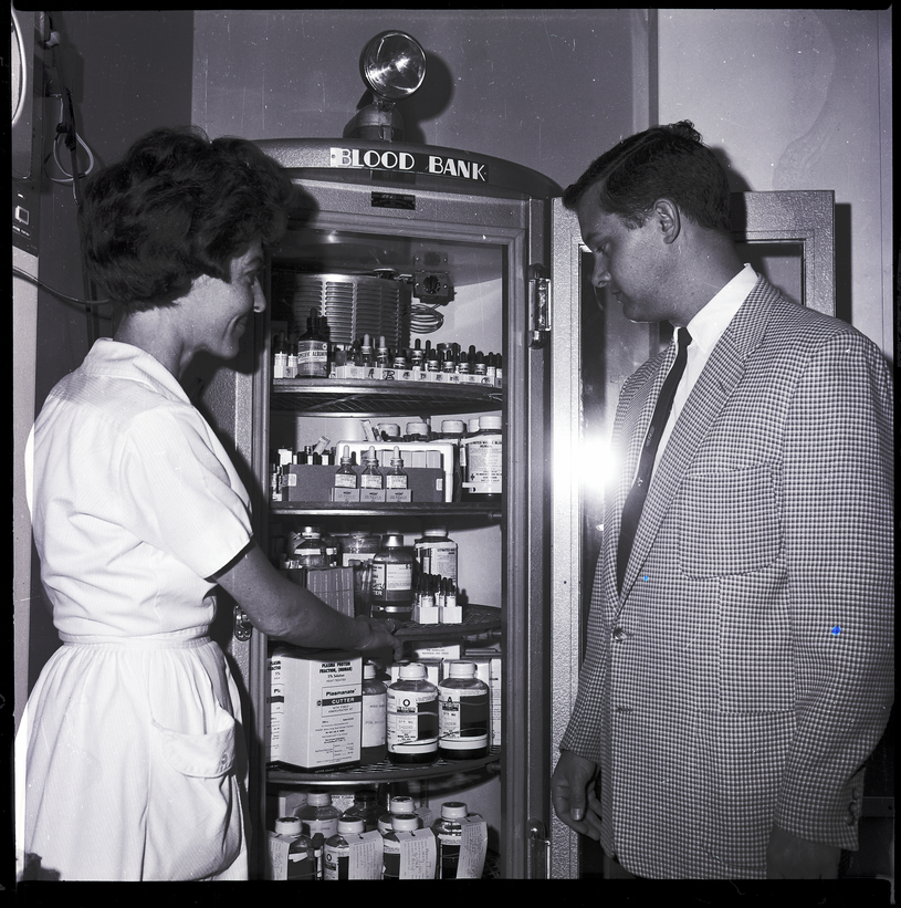 Pat Hankins, lab technician, shows Jack Swisher, blood drive chairman for the Twin Falls chapter of the American Red Cross, a cabinet filled with bottles of blood at the Magic Valley Memorial Hospital. The cabinet has a sign at the top reading "Blood Bank." Small bottles are on the top shelves of the cabinet, while large bottles labeled "O Negative" and "A Negative" are on the bottom shelves. Several bottles have informational tags attached to them. A box labeled "Plasma Protein Fraction, (Human) Plasmanate Cutter" is also visible.