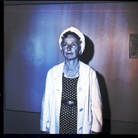 Frances Sande, organizer of the Interdenominational Divine Order, poses in a hallway at the I-Do building located on 519 Main Ave. W. in Twin Falls, Idaho. She is dressed in a polka dot dress, white jacket, and a white scarf wrapped around her head. A picture hangs on the wall behind her.