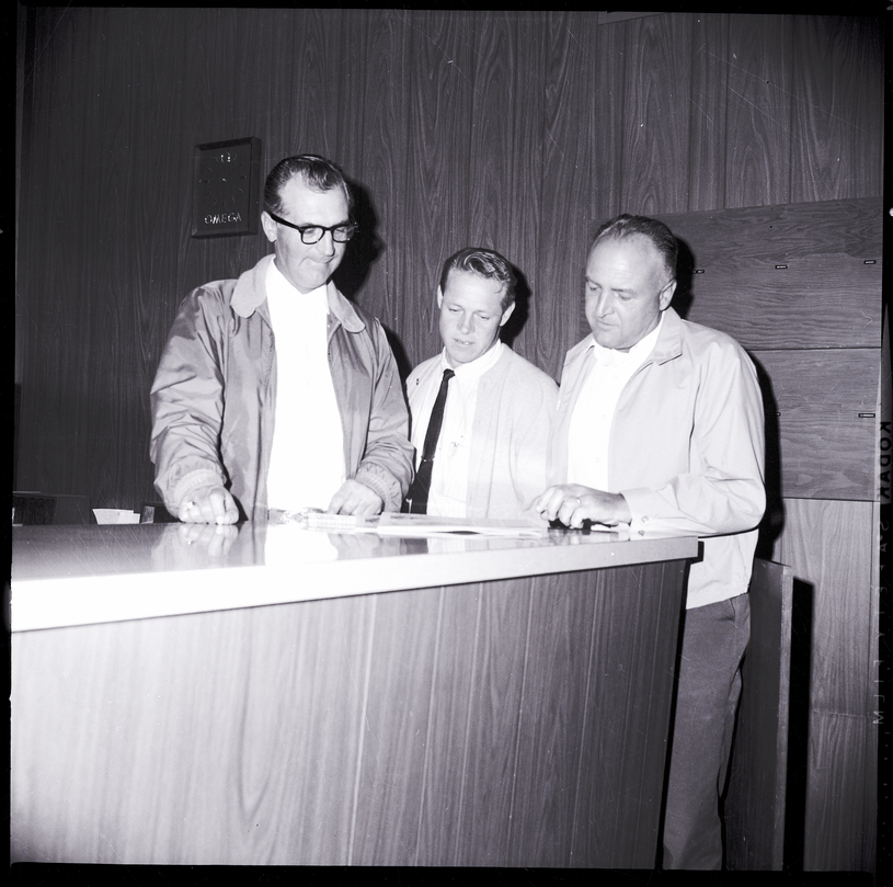 Making plans for the annual FFA and 4-H Fat Stock Show and Sale, scheduled for September 25th at the Twin Falls Livestock Commission Company, are from left to right, Cecil Brim, owner of the commission company which is donating facilities for the sale; John Lawrence, vocational agriculture instructor at Twin Falls High School, and a member of the show and sale committee; and Ed Shaff, chairman of the committee. The three men stand behind a counter and look over some documents. A clock is hanging on the wall behind them.