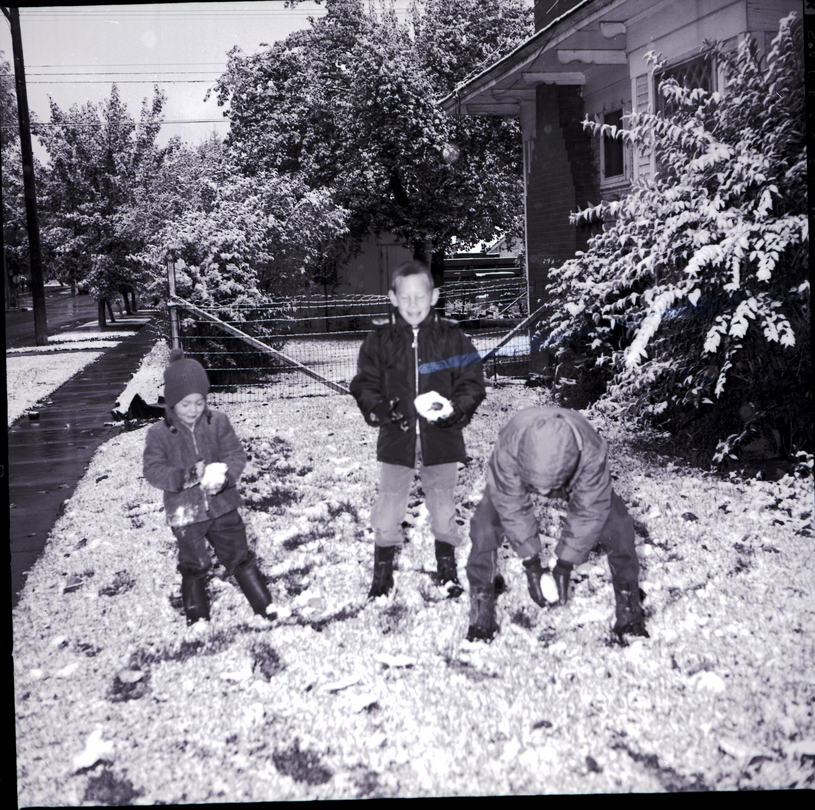 J. B. Cilek, Jeff Cilek, and James Cilek, sons of Mr. and Mrs. Joe Cilek, make snowballs in the front yard of a house after the first heavy snowfall in Twin Falls. The children are dressed in coats and snow boots. Several trees and bushes are in the background, the branches covered in snow.