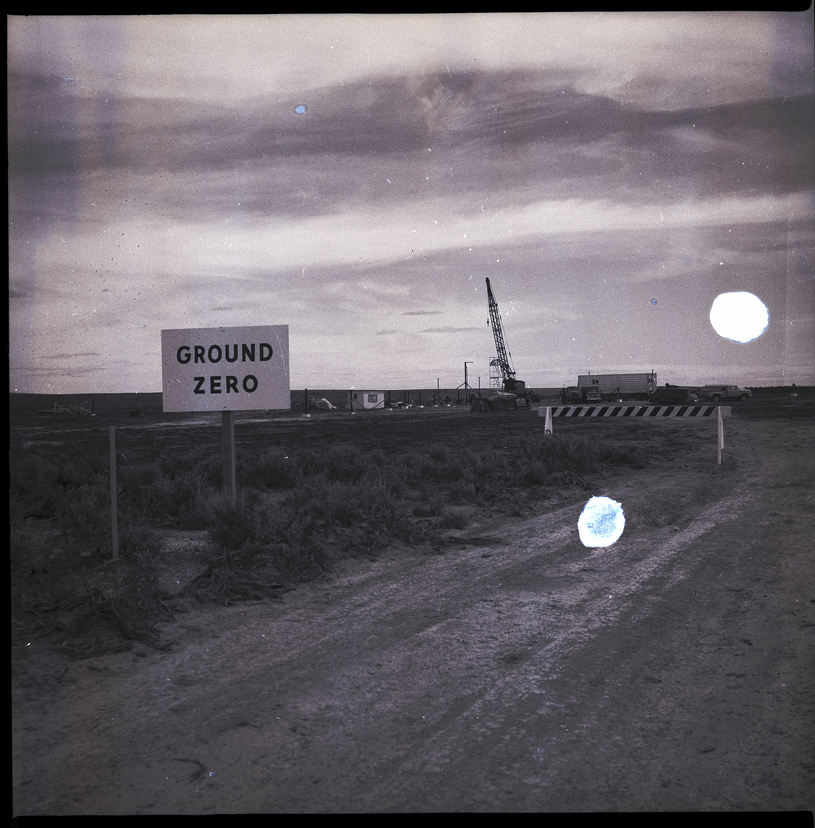 - A dirt road leads up to the Project Pre-Schooner II site on Bruneau Plateau. A sign surrounded by sagebrush nearby reads "Ground Zero." In the background behind a wooden A-frame barricade are several trucks, a shack, and a construction crane.