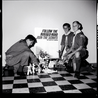 at Christmas. From left to right are Charles Smith, Mike Cook, and Greg Skinner. Behind them is a Boy Scouts of America poster that shows an illustration of some Boy Scouts canoeing down a river, with text above that reads "Follow the Rugged Road. Join the Scouts. Boy Scouts of America."