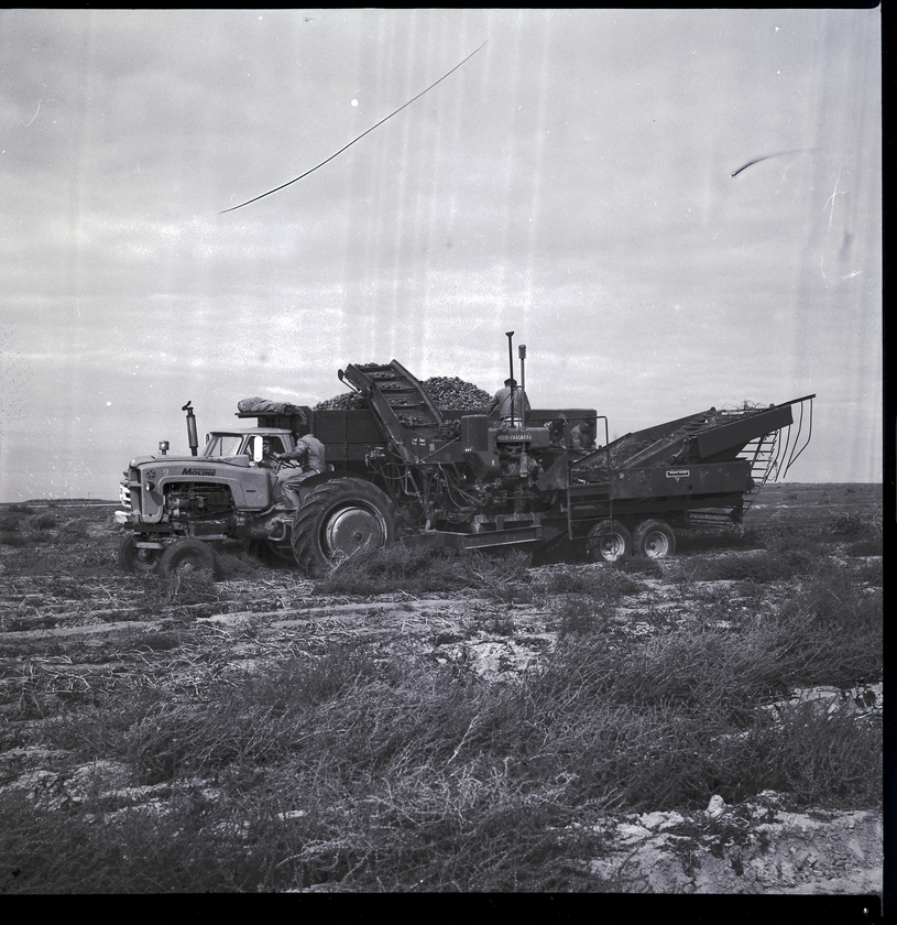 Harvesting potatoes near Jerome is one of several harvesters and crews of Charles Marshall. A two-row potato harvester truck is loaded with potatoes. Two men are at the front of the truck, while three others work in the back, looking over the potatoes. The truck is sitting in a field covered in dirt, weeds, and dead plants that stretches into the background.