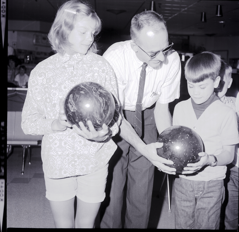 Frank Olsen, instructor for the Brunswick Learn to Bowl program at the Bowladrome, hands a bowling ball to Holland Houfburg Jr. Another boy stands behind him. Louise Parks stands beside them, holding a bowling ball. Behind the group some people can be seen seated in the bowling alley.