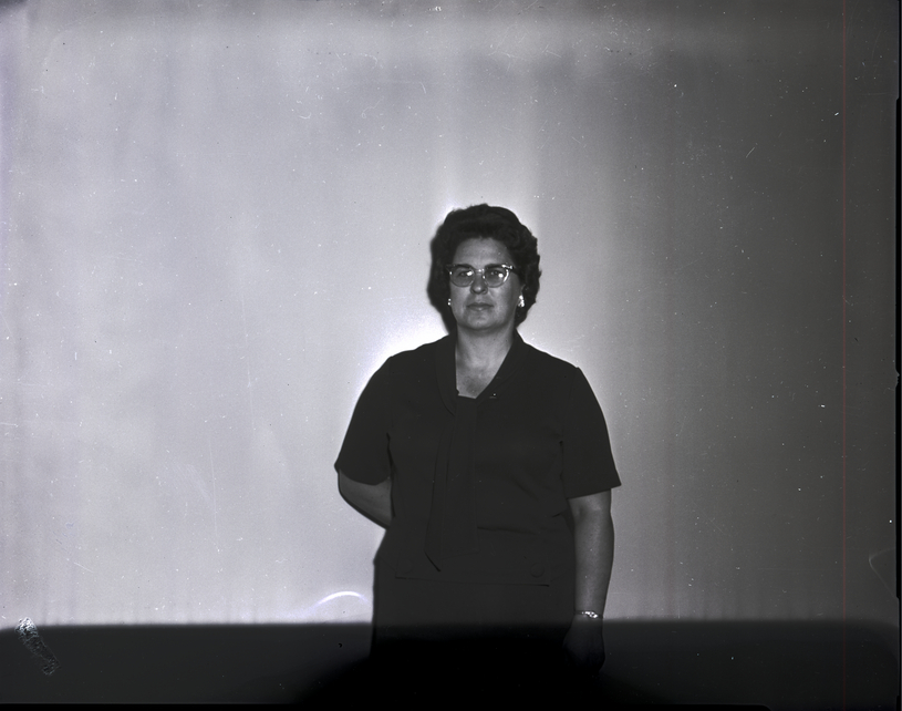 - Mrs. Lisle Fullmer, president of the Emanon Club, stands in a hallway. She is wearing a black dress.