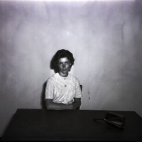 - Mrs. William Bolster, president of the Magic Toastmistress Club, sits behind a desk. She is wearing a striped dress. A purse sits on the table.