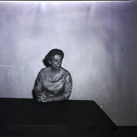- Mrs. Wendell Grout, president of the Altrusa Club, sits behind a desk. She is wearing a patterned dress.