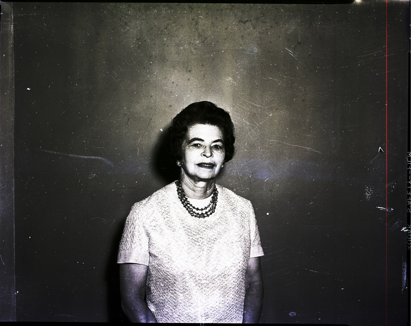 - Mrs. Robert Miller, president of the Wesleyan Service Guild, stands in a hallway. She is wearing a white dress.