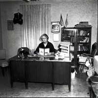 Mrs. James Vandenbark, executive director of the Twin Falls Camp Fire Girls Council, sits behind a desk in an office. She is wearing a jacket over a blouse, with a pin in the collar, and is holding the Camp Fire Girls handbook. On the desk are some books, photographs, a telephone, a pot of flowers, and an organizer filled with papers. In the corner is a bookcase filled with books, and on top of the bookcase are a small American flag and another flag. Some framed pictures hang from the wall. Behind the desk is a window covered in drapes, and a vest hangs from the corner. Several folding chairs are against the walls of the room.