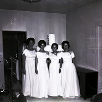 Officers of OES number 82 model their chapter gowns in a living room. From left to right are Mrs. Howard Ehresman, conductress, Mrs. Donald Sonius, associate conductress, Mrs. Norman Webb, associate matron, and Mrs. Joseph McMillan, worthy matron. The four women are all dressed in white gowns and corsages. Behind them is a white cross. A cabinet is in the corner, and on it are a framed photograph and some china. A purse is on the floor. A desk is against a side wall. The kitchen is seen through a doorway.