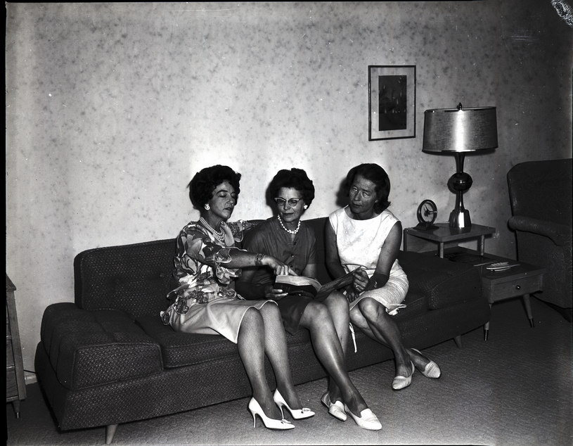 Three members of the League of Women Voters sit on a couch and discuss plans to educate voters. From left to right are Mrs. James Brennan, first vice president, Mrs. Bernard E. Barker, a new member, and Mrs. T. M. Robertson, treasurer. Mrs. Brennan is wearing a blouse and skirt and the other two women are wearing one-piece dresses. On a stand beside the couch is a lamp, a clock, and an ash tray. A framed picture hangs on the wall. A recliner is in the corner.