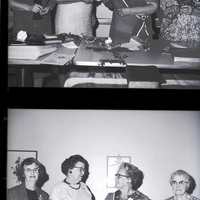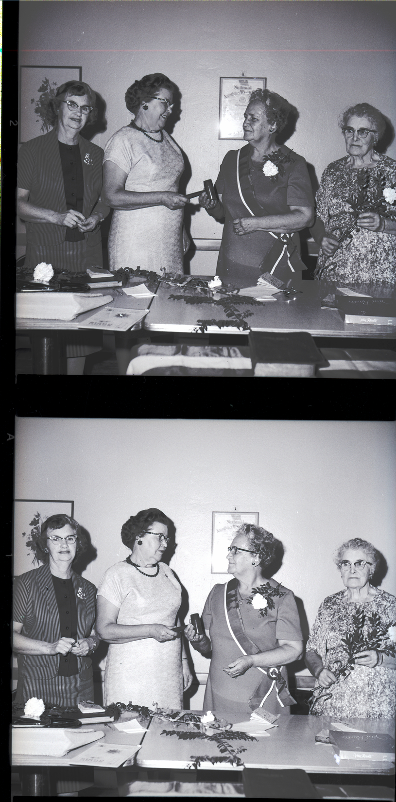 Officers were installed at an American War Mothers meeting held at the American Legion Hall in Twin Falls. From left to right are Mrs. Joseph LeClair, recording secretary; Mrs. B. V. Vice, first vice president and installing officer; Mrs. William Armga, president and state recording secretary; and Mrs. W. C. Stone, treasurer. Mrs. LeClair is wearing a striped jacket and skirt and a black blouse. Mrs. Vice wears a white dress, and hands a gavel to Mrs. Armga, who is wearing a dress, corsage, and sash. Mrs. Stone is wearing a floral print dress and holding a carnation. On the table in front of them are several papers, books, and cut carnations. On the wall behind them is a framed illustration of some flowers and a certificate from the National American War Mothers.