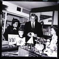 Two Den Mothers for the Cub Scouts meet with a man at the Idaho Department Store to publicize the Den Mother's Workshop. From left to right are Mrs. Gerri Smith, Robert Harvey, Idaho Department Store manager, and Mrs. Nina Fisher. The women are wearing their uniforms, and Mr. Harvey is dressed in a suit and tie. Several toys and collectibles sit on top of a glass display case. On the adjacent counter a mannequin bust is dressed in a Cub Scout hat and t-shirt. A display behind the mannequin head shows several official scout knives. In the back of the room is a pennant that reads "Boy Scouts of America, Do a Good Turn Daily." Below it is a shelf that has a trophy, bird house kit, and some Cub Scout supplies. Shelves in the back of the room contain boxes of official Cub Scout shirts from the Boy Scouts of America.