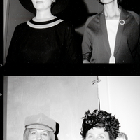 Women gather at a Christian Women's Club luncheon held at the Twin Falls YWCA. In the top image, the woman on the left is wearing a black dress with a wide-brimmed black hat, and the woman on the right is wearing a jacket over a blouse with a beanie. In the bottom image, Mrs. Wayne Rose is wearing a blazer and a cap, and Mrs. Ron Booth is wearing a white dress with a black hat covered in black feathers. The hats modeled were from The Paris in Twin Falls.