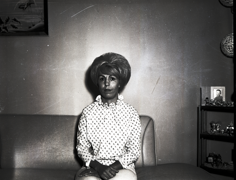 Mrs. Marvin Adams, president of Typographical Union No. 241, sits on a couch. She is wearing a floral print shirt and slacks. In the corner is a display case filled with figurines. On top of the display case is a photograph and a lamp. A framed landscape painting hangs on the wall above her.