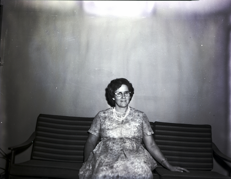 Church, sits on a couch. She is wearing a floral print dress and a pearl necklace.