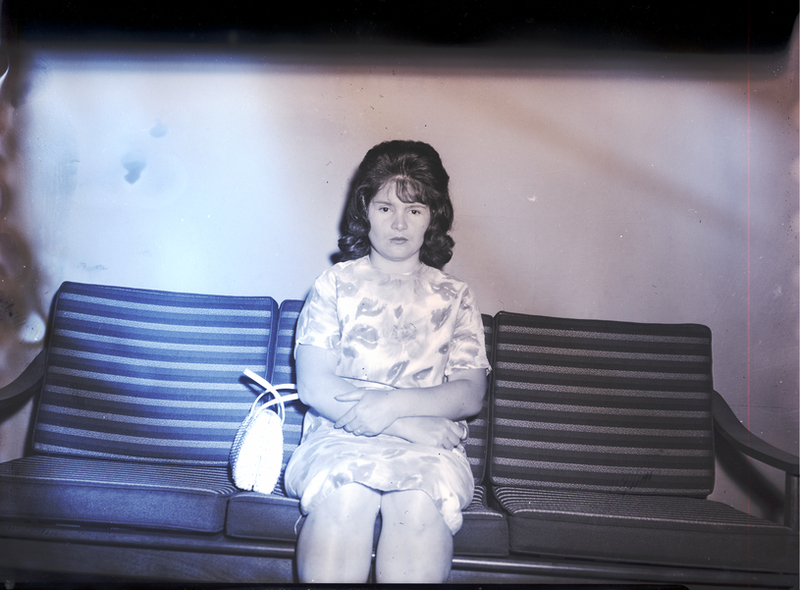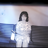 - Mrs. Ronnie Pope, president of the Magic Valley Young Wives, sits on a couch. She is wearing a floral print dress. A purse sits beside her on the couch.