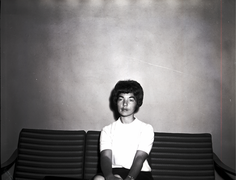 - Mrs. Nedra Gentry, president of the Community Y Wives, sits on a couch. She is wearing a white shirt and black skirt.