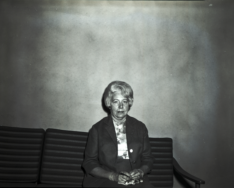 - Mrs. Melvin Sackett, president of the Alpha Delta Kappa Delta Chapter, sits on a couch. She is wearing a jacket, skirt, and floral print blouse.
