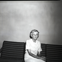 - Mrs. Alfred House, president of the MS and S Club, sits on a couch. She is wearing a white button-up top and skirt.