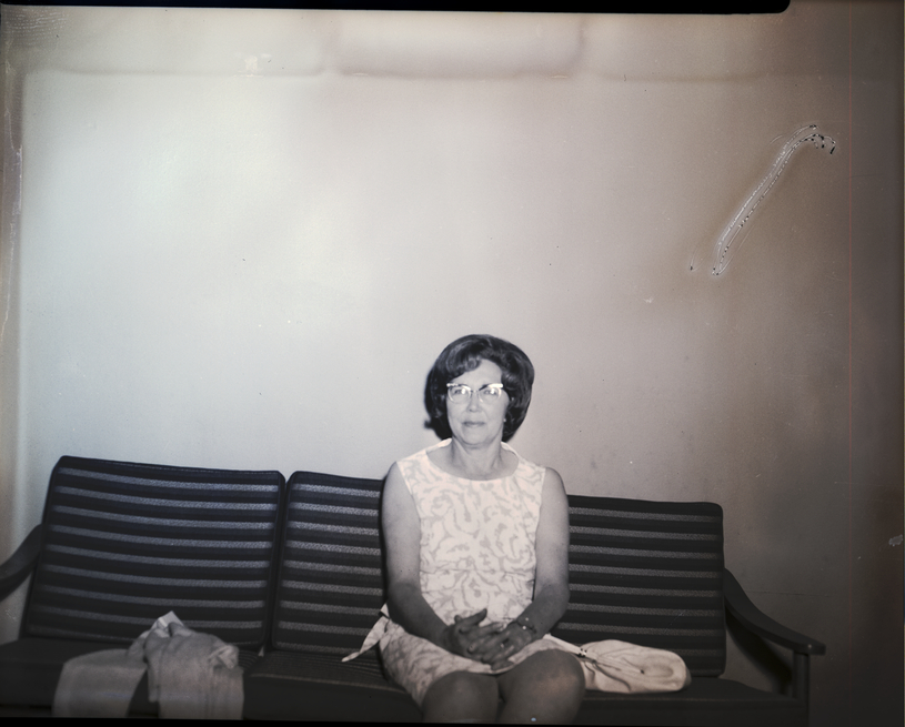 Mrs. Robert Tucker, president of the Eva Marie Guild, a mission study group within the Christian Woman's Fellowship of the First Christian Church, sits on a couch. She is wearing a patterned sleeveless dress. A jacket and a purse are sitting on the couch beside her.