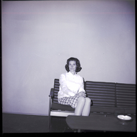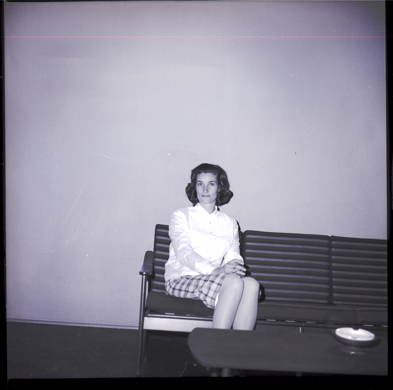 Mrs. Russell Smedley, president of the Modern Mrs. Club, sits on a couch. She is wearing a white blouse and a plaid skirt. There is a table in front of the couch, and on the table is an ash tray.