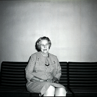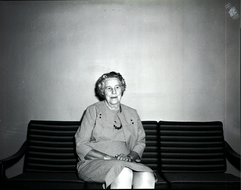 - Mrs. Emma Steffen, president of the Amoma Class at the First Baptist Church, sits on a couch. She is wearing a checkered dress and jacket.