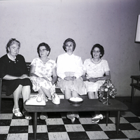 Officers of the Country Woman's Club sit on a couch. From left to right are Mrs. L. V. Nicholson, corresponding secretary; Mrs. Edward Waite, secretary; Mrs L. E. Bird, vice president, and Mrs. Carrie Modlin, president. All the women are wearing dresses. In front of the couch is a table, and on it are a telephone, ash tray, and centerpiece of fruits and flowers. On a stand to the side of the couch is a lamp.