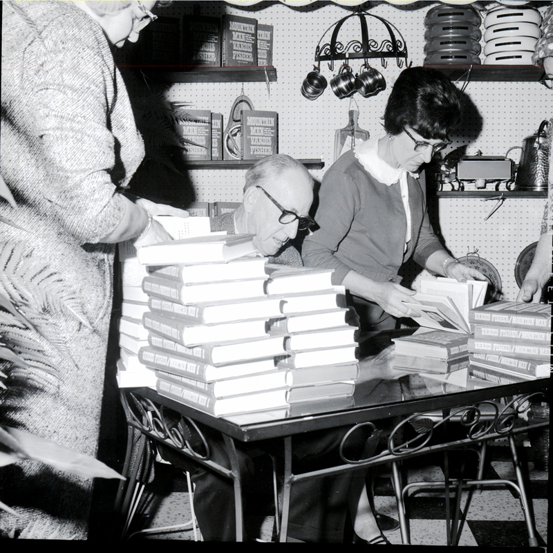 Vardis Fisher signs copies of his book "Mountain Man" at Sallie's Gifts & Books in Twin Falls. He is seated at a table covered in stacks of the book. Two women stand by the table, looking at the books. On the shelves behind him are copies of the book and various antiques and gift items.