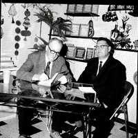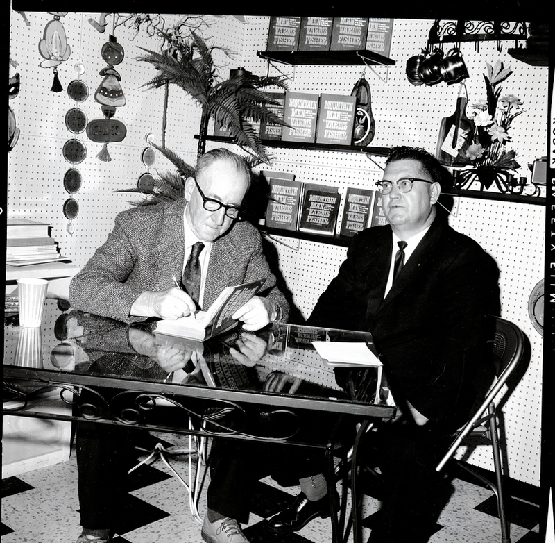 Vardis Fisher signs copies of his book "Mountain Man" at Sallie's Gifts & Books in Twin Falls. He is seated at a table and Twin Falls City Manager H. L. Derrick sits beside him, getting his book signed. On the shelves behind him are copies of the book and various antiques and gift items.