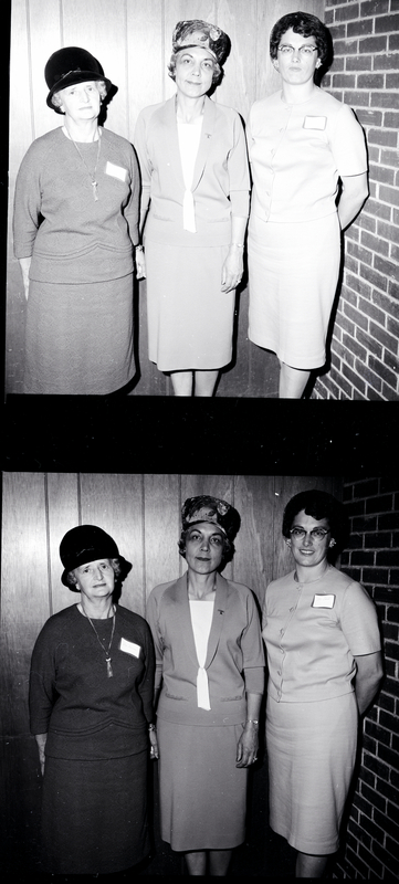 Assisting with the arrangements to organize a Cowbelles unit for the Twin Falls, Jerome, and Three Creek area are, from left to right, Mrs. Lorinda Wines, president of the American National Cowbelles, Mrs. Russell C. Larsen, past president of the Idaho Cowbelles and acting president of the organizational group, and Mrs. Erin Lord, president of the Idaho Cowbelles. An organizational luncheon was served at the Depot Grill. They are wearing blouses and skirts, and Mrs. Wines and Mrs. Larsen are wearing hats.