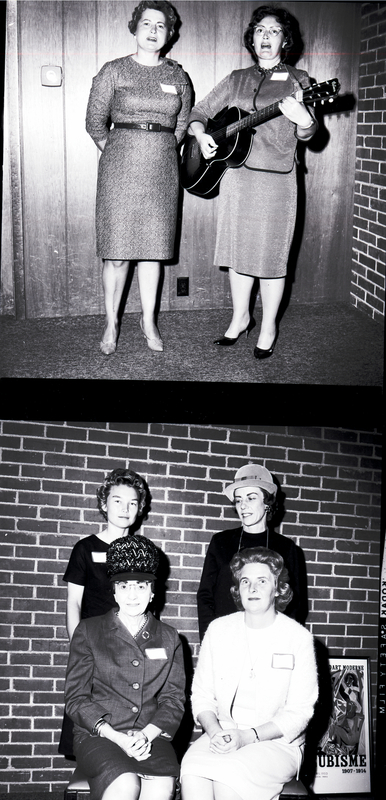 In the top image, Mrs. Charlotte Crockett and Mrs. William Kinsey provide musical entertainment at a luncheon meeting for the newly organized Twin Falls Cowbelles held at the Depot Grill. Mrs. Crockett is wearing a dress, and Mrs. Kinsey is wearing a top and skirt and is holding a guitar. In the bottom image, standing from left to right are Mrs. Larry Lickley, president-elect of the local Cowbelles group, and Mrs. Cecil Brim, courtesy chairman. Seated from left to right are Mrs. Harry Eaton and Mrs. Ralph Olmstead, secretary-treasurer of the local unit. They are wearing blouses and skirts and two of the women are wearing hats. A print of a cubist painting rests against the wall behind them.