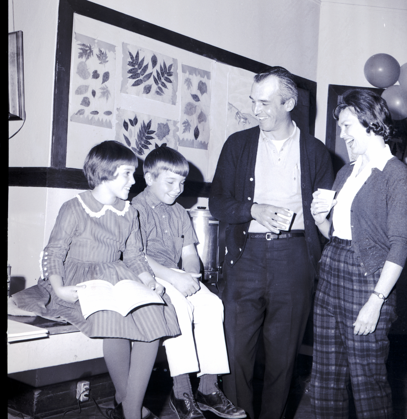 Dilettante lead players Lynette Berry, Mark Herzinger, James LaGrone, and Mrs. Marty Mead meet for a cast call. Lynette Berry, seated on a counter and wearing a dress, holds the score for "The Music Man," and Mark Herzinger, wearing a patterned shirt and slacks, sits beside her. James LaGrone and Mrs. Mead, dressed in shirts, sweater jackets, and slacks, hold Styrofoam cups. Some pictures of different leaves are on the bulletin board on the wall behind them. Some balloons are in the corner of the room.