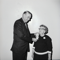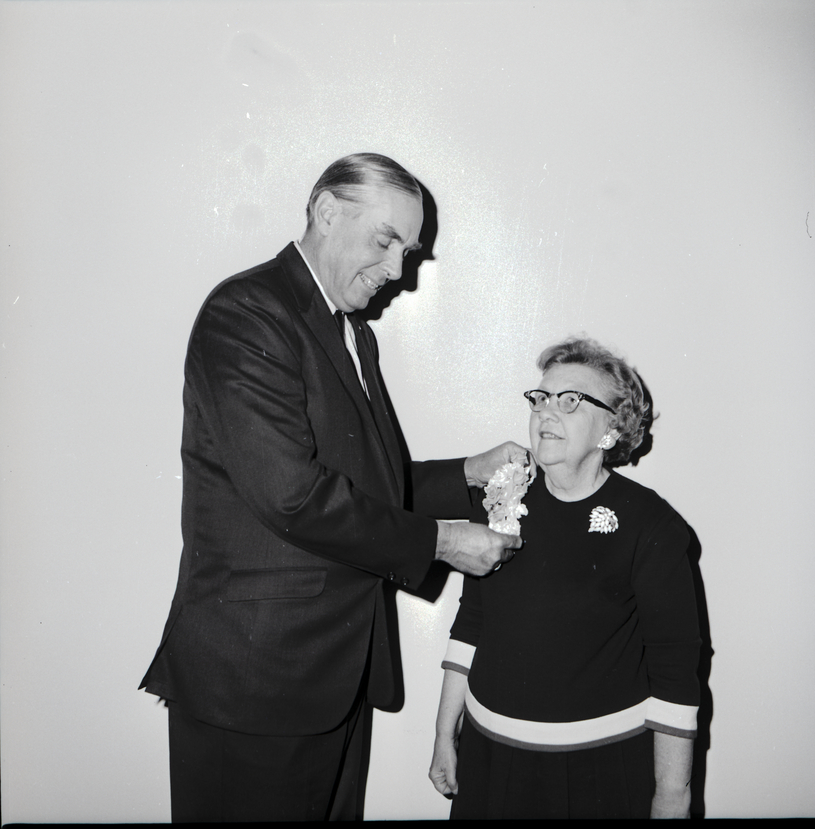 of School District 411, pins a corsage onto Idaho Teacher of the Year Ida Allen, who teaches first grade at Harrison Elementary School in Twin Falls. Mr. Ragland is dressed in a suit and tie and Ms. Allen is wearing a top and skirt.